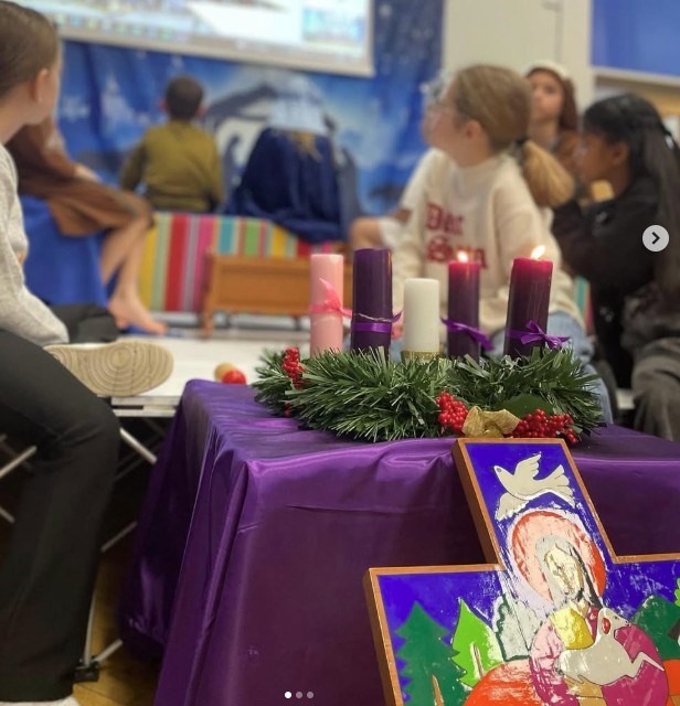 Prayer tables draped in purple appear across all classrooms, marking the season of Advent.
